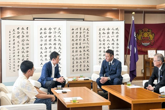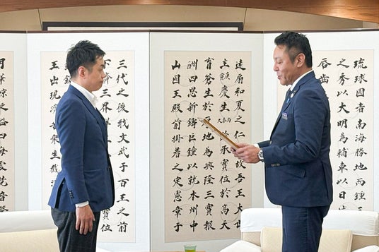 写真左:沖縄市 花城 大輔市長、右:スチームシップ 代表取締役 藤山雷太