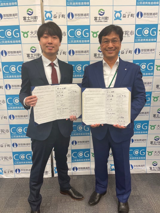 写真右 富士川町長 望月利樹氏 (写真左 REDEE株式会社 代表取締役社長 密山 裕貴)