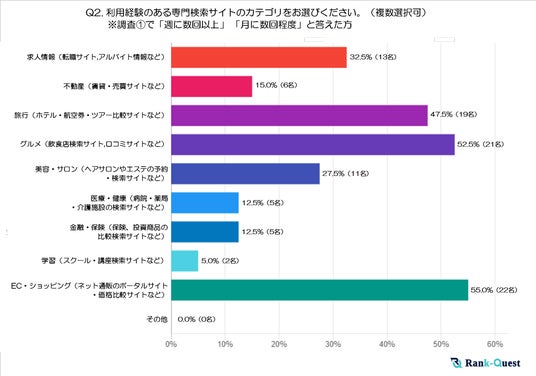 最も多かった回答は「EC・ショッピング」(55%)で、週に数回以上または月に数回程度といった比較的アクティブに専門検索サイトを利用している層の半数以上が、ネット通販や価格比較サイトを活用していることがうかがえます。