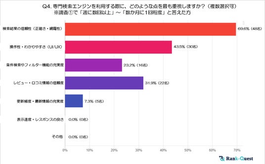 最も多かった回答は「検索結果の信頼性(正確さ・網羅性)」(69.6%)でした。“確かな情報と幅広い選択肢”を専門検索サイトに求めていることが分かります。