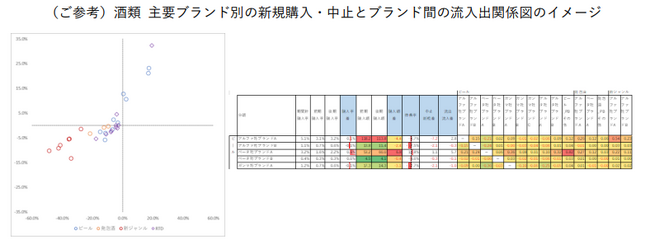 今回の分析では、ビール類にRTD(Ready To Drink)も加え、主要ブランドごとに酒税改正後の新規購入・中止、ブランド間の流入出の度合いも確認しております。詳細についてはご要望の企業様に個別にご説明させていただきますので、お気軽にお問い合わせください。