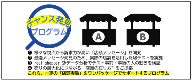 ショッパー(買物中のお客様)に向けてどのようにアクションすれば自社ブランドの購入に至るのか、またリピートしていただけるのはどのような場合か、について、仮説を実店舗店頭で検証できるプログラムです。