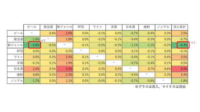 カテゴリ間の変化では、「新ジャンル」→「ビール」への移行(流出)が約2.6%発生