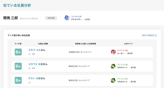 そこで蓄積された性格データを元に、チェックしたい対象者の似ている社員を抽出します。対象者は社員様、候補者様どちらも選択することが出来ます。