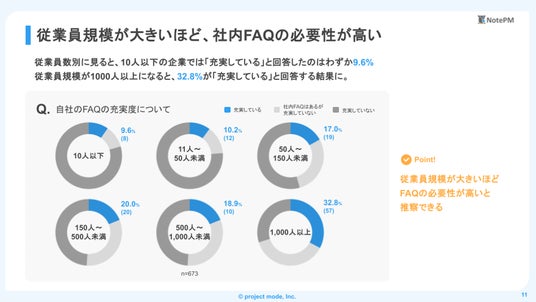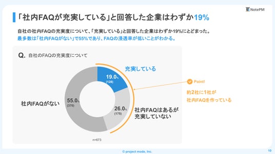 ナレッジマネジメント専門のITツール「NotePM」を提供する株式会社プロジェクト・モードは、(本社:神奈川県川崎市、代表取締役社長: 小澤 卓馬)は、国内企業に勤める経営者・会社員673名を対象に社内FAQの活用に関するアンケート調査を実施。実態をまとめたレポートを公開しました。
