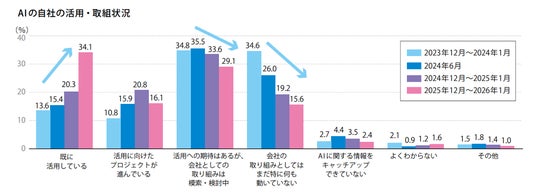 AIの活用状況は、「既に活用している」(34.1%)と「活用に向けたプロジェクトが進んでいる」(16.1%)を合わせると50.2%となり、本調査で初めて5割を突破しました。AIが試行段階から本格的な活用段階へと移行しつつあることがうかがえます。