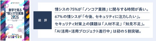株式会社ソフトクリエイト(本社:東京都渋谷区/代表取締役社長:林 宗治、以下 ソフトクリエイト)は、情報システム部門の現状を把握するため、「情報システムの現状とIT活用実態アンケート 2026」を実施しました。本調査は第8回目となり、情報システム部門向けメディア「情シスレスキュー隊」で調査結果を公開しました。