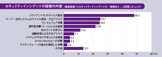 この結果から、セキュリティ対策の重要性が経営・現場の共通認識として定着しつつあることがうかがえます。セキュリティインシデントの経験内容では、ランサムウェアやクライアントPCのウイルス感染に加え、「その他」ではビジネスメール詐欺なども挙げられました。特定の攻撃手法に限らず、リスクが分散・多様化している点が今回の調査の特徴です。