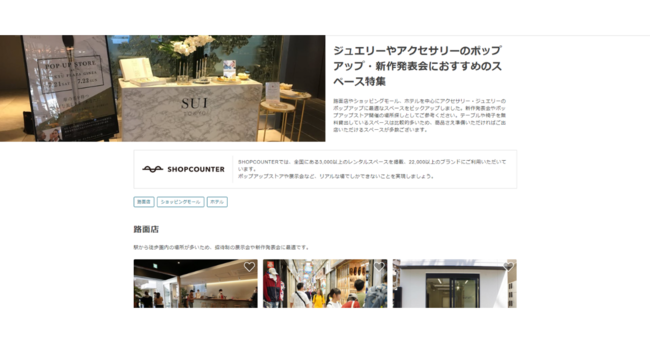 株式会社COUNTER WORKS(東京都目黒区、代表取締役CEO:三瓶直樹)が提供する商業不動産のマーケットプレイス「SHOPCOUNTER(ショップカウンター)」は、路面店、ショッピングモール、ホテルを中心とした「ジュエリーのポップアップストアにおすすめのスペース特集」を公開しました。