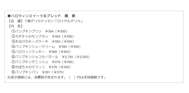 1階デリカテッセン「ロイヤルデリカ」では、お化けのチーズケーキや、生地にかぼちゃを使用したシュークリーム、ハロウィンデザインのポットも愛らしいパンプキンプリン、ハットをモチーフにしたかぼちゃペーストのモンブランなど期間限定スイーツ&ブレッドを販売します。