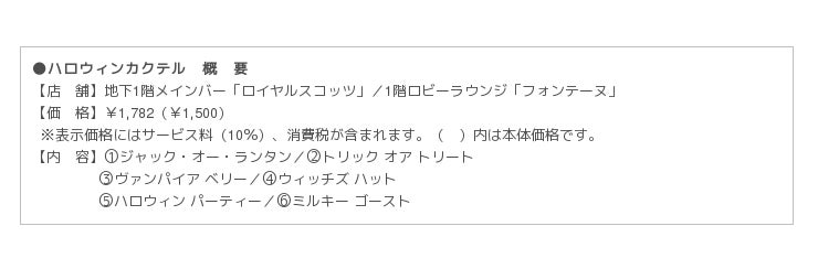 地下1階メインバー「ロイヤルスコッツ」ならびに、1階ロビーラウンジ「フォンテーヌ」では、「大人のハロウィン」をテーマにした創作カクテルを6種ご用意いたしました。