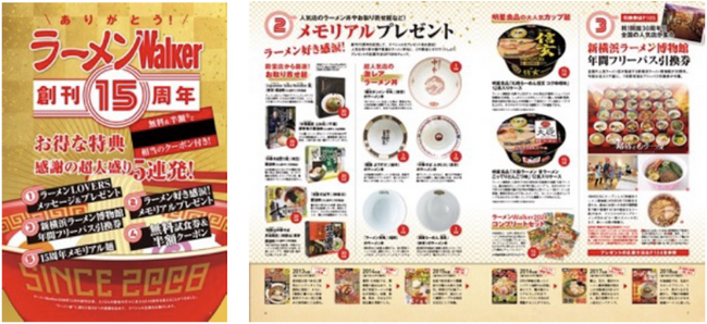 創刊15周年を記念した巻頭企画では、「ラーメンWalker」ゆかりのラーメンLOVERSからのメッセージや、歴代表紙でラーメン文化の発展やムーブメントを振り返る企画など、メモリアルコンテンツが満載。また、無料や半額で絶品ラーメンを試食できる特典のほか、超人気店の貴重なラーメン丼や厳選した殿堂店のお取り寄せ麺などが当たるプレゼント特集など、お得な企画が盛りだくさんの内容です。