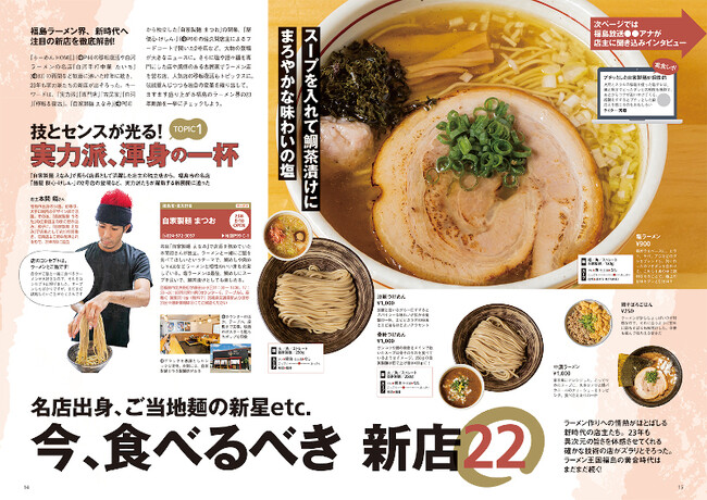 確かな腕でオープン直後から話題の実力派から、塩ラーメンや担々麺などの新ジャンル、古民家風ラーメン店など、2022~2023年にオープンした新店22店をジャンル別に紹介します。殿堂店から独立を果たした「自家製麺まつお」や塩ラーメン旋風を巻き起こしている「麺屋 ソルト」、シビれるウマ辛麺で人気の「郡山たんたん麺」など、福島エリアで今勢いのある注目店がこの一冊に。