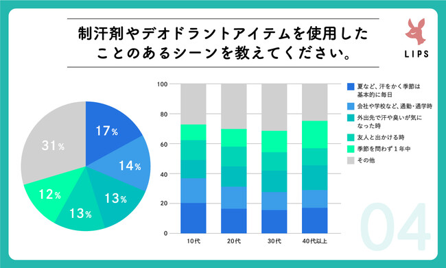 また年代別に見てみると、40代では夏だけでなく季節を問わずに1年中"ニオイ"ケアをしているという人が約2割という結果に。年齢を重ねるごとに臭いが変化することが要因のひとつと考えられます。