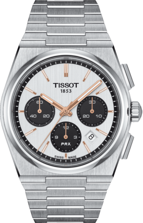 これまで時刻と日付表示のみであったPRXコレクションに、高機能のティソ PRX オートマティック クロノグラフ [Tissot PRX Automatic Chronograph]が登場します。ホワイトのダイアルに対照的なブラックのサブダイアルをあしらった、いわゆる“パンダ”ダイアルを採用。サテン仕上げのステンレススチールケースとトノー型の滑らかなフォルムはそのままに、リラックスした1970年代のスポーツウォッチのスタイルをもたらしています。また、ムーブメントはバルジュー A05.H31を搭載。3時、6時、9時位置にクロノグラフダイヤルを配したクラシックなデザインで、最長60時間のパワーリザーブを提供します。