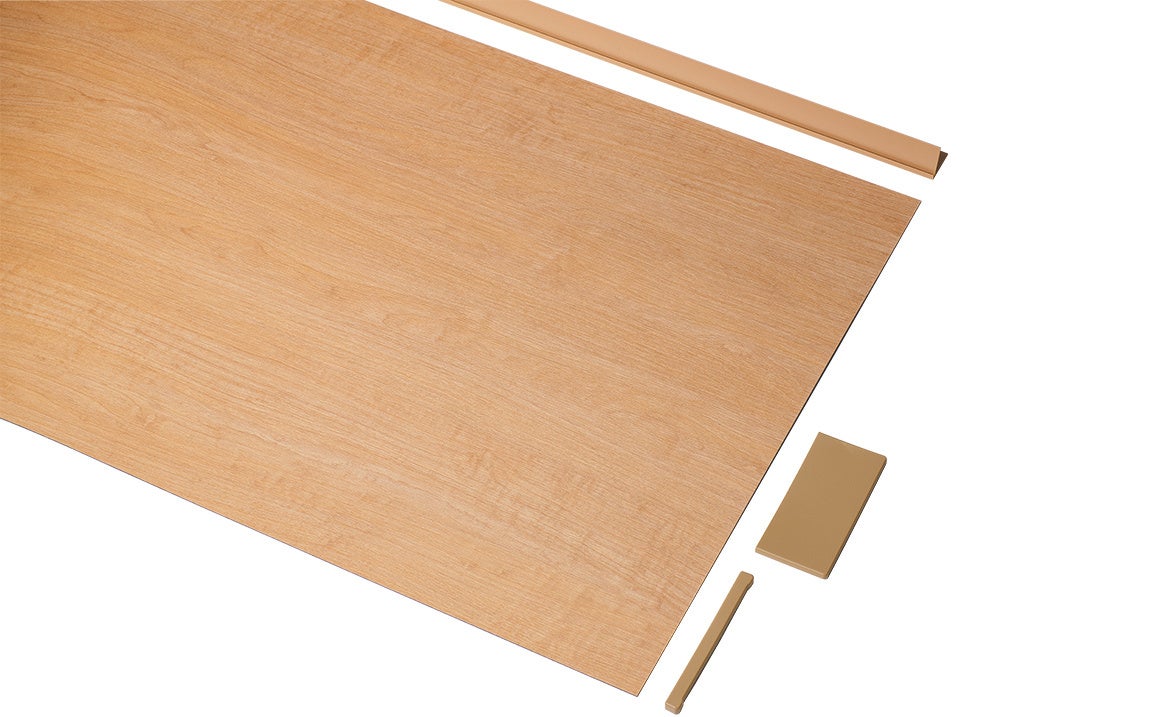 カバー材は展開形状で加工がカンタンカットが平面上でおこなえるうえ、柔らかい樹脂製なので加工が簡単です。また、専用部材のチリ部カバー材、小口キャップも樹脂製なのでカッターで加工が可能です。