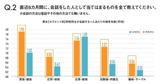 調査により、女性は家族や親戚とのコミュニケーションの相手先数が男性よりも格段に多いことが分かりました。これは女性が家族や親族と強い絆を持っていることを示唆しています。また、地域や近所との交流においても男性より高い数値を示しており、地域社会とのつながりを大切にしていることが伺えます。このことから、家族向けのイベントや親戚との交流を促進するプログラムや地域コミュニティにおける活動をさらに促進するためのプログラムの開発により、女縁をさらに強めることで、女性が持つコミュニケーション能力と社会的ネットワークを生かした活動を推進することが期待されます