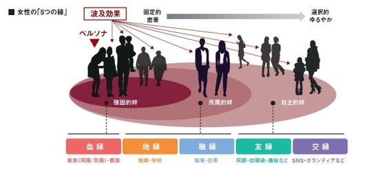 「女縁(おんなえん)」とは、女性同士のつながりやネットワークを指す言葉で、日常生活や職場などさまざまな場面で形成される女性同士の結びつきを表します。女性の最も多いライフコースのパターンは、就職し、結婚し、出産し、子育てをし、親の介護なども経験するというケースです。このライフコースの場合、大きく5つの縁(血縁・地縁・職縁・友縁・交縁)が広がります。そして、これらの「女縁」を理解することは市場を理解することに直結します。女性がどのように情報を得て、どのように意思決定を行うかを把握することで、より効果的な戦略を展開することが可能となるからです。
