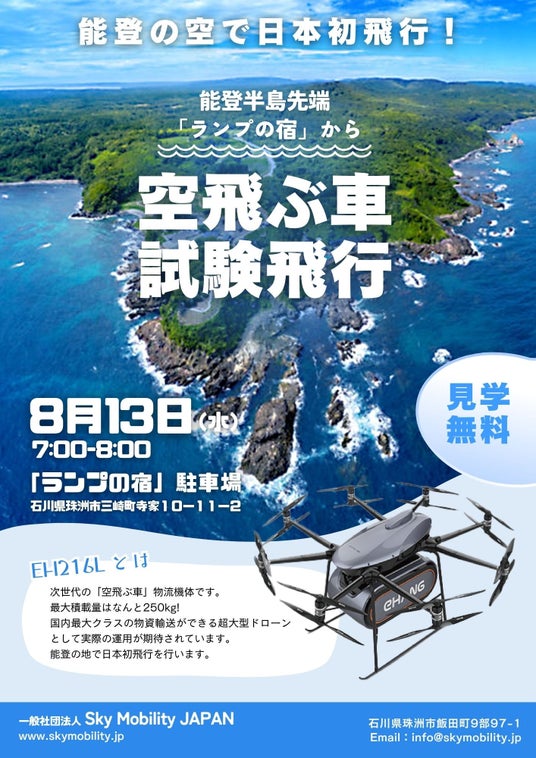 「一般社団法人SKy Mobility JAPAN」(本社:石川県珠洲市、代表理事:浦達也)及び「一般社団法人日本ドローンビジネスサポート協会」(本社:岡山市、代表理事:森本宏治)は石川県珠洲市において国内初となる「EH216L」の試験飛行を行います。なお、本事業は「一般社団法人MASC」(本社:岡山県倉敷市、理事長:井上 峰一)が行う飛行試験を支援するものとなります。