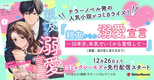 株式会社テラーノベル(本社:東京都港区、代表取締役社長:蜂谷宣人)はこの度、累計DL数760万(※)の小説共有プラットフォーム「テラーノベル( https://teller.jp/ )」発の人気小説『涙が恋に変わるまで』がコミカライズされ、『親友からの溺愛宣言~10年分、本気でいくから覚悟して~』として12月26日よりコミックシーモアにて先行配信を開始することをお知らせいたします。