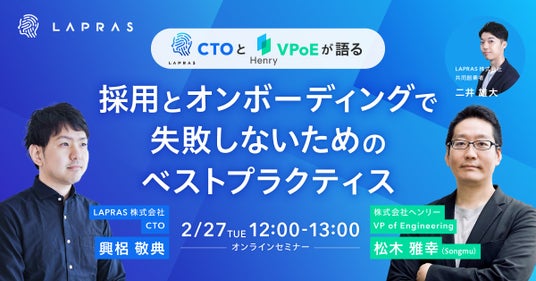 LAPRAS株式会社(所在地:東京都品川区、代表取締役:染谷健太郎 以下、LAPRAS社)は、株式会社ヘンリーと共催で「エンジニア採用とオンボーディングで失敗しないためのベストプラクティス」についてのウェビナーを2月27日に開催します。