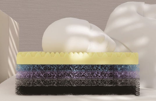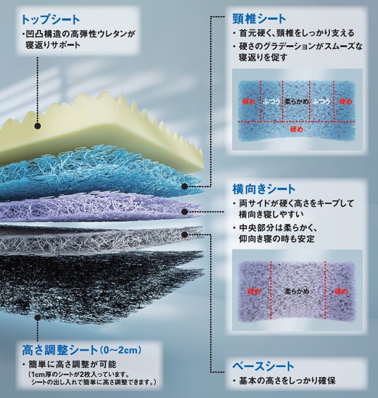 トップシートから頸椎シート、横向きシート、ベースシート、高さ調整シートと、層ごとに異なる機能を有する多層構造。それぞれ役割をもつ各層が快適な寝姿勢をしっかりとサポートします。