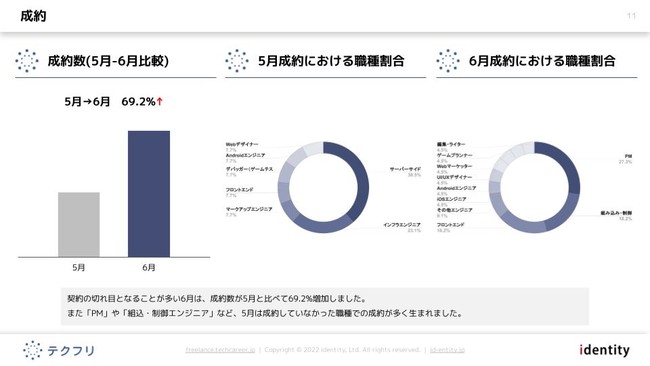 契約の切れ目となることが多い6月は、成約数が5月と比べて69.2%増加しました。また「PM」や「組込・制御エンジニア」など、5月は成約していなかった職種での成約が多く生まれました。