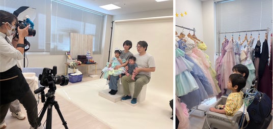 本プロジェクトは、病院内においてスタジオアリスの撮影スタジオを再現し、ご家族の思い出作りのために非日常体験を楽しんでいただき、ドレスやタキシード、着物などお好みの衣装選びからはじまり、ヘアセットやお着替えをしていただいた後、とっておきの思い出の家族写真を撮影し無償でプレゼントいたしました。スタジオアリスとしては小児病棟における出張撮影会は初の試みとなります。今回の取り組みを皮切りとし、全国の心移植関連施設を中心に、今後もあけみちゃん基金と連携し、家族写真撮影会を展開していく予定です。
