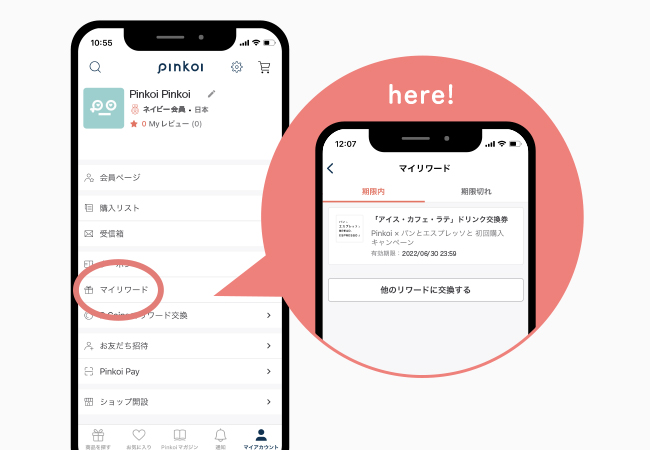購入完了後「マイリワード」にドリンク交換券2枚が付与されます