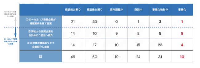 自治体事例データベース|ローカルハブ(事業開発者:佐々木大地)を提供する株式会社クラウドシエン(本社:広島県広島市、代表取締役:神原 翔吾)は、2022年05月29日(日)より、57自治体と行っている、本質的な官民マッチングを生むための、官民連携分野における実証事業実施を行いました。40以上の事業化検討を行え、官民連携におけるローカルハブの有効性が実証されました。一方で、自治体庁内の各所管部署の課題収集と自治体に向けた企業情報開示を行うことが、重要だとわかる実証となりました。