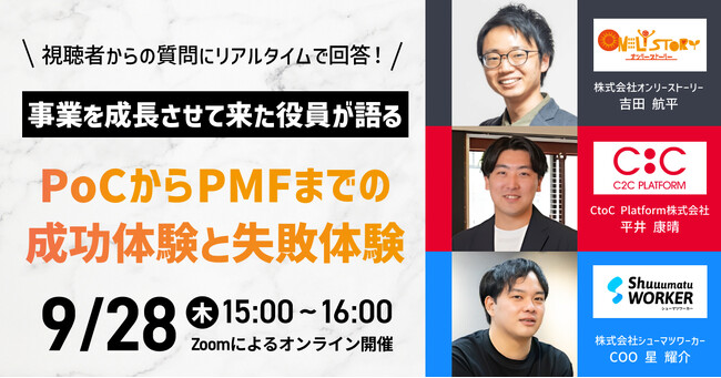 C2C Platform株式会社(本社:東京都港区、代表取締役社長:薛 悠司)と株式会社シューマツワーカー(本社:東京都渋谷区、代表取締役:松村 幸弥、以下シューマツワーカー)と株式会社オンリーストーリー (本社:東京都渋谷区、代表取締役CEO:平野哲也、以下オンリーストーリー)は、2023年9月28日(木)に無料ウェビナー「PoCからPMFまでの成功体験と失敗体験」を開催いたします。