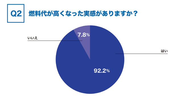 しかしながら、燃料代が高くなったと感じないと回答した方が7.8%いることもわかりました。使用頻度にもよるのでしょうか。価格が高くなったと感じる基準は人それぞれですね。