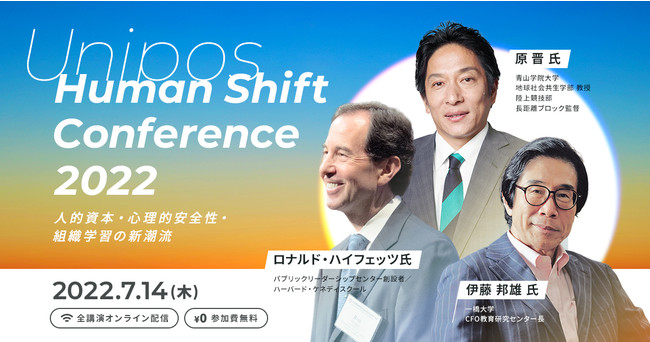 心理的安全性を高め、挑戦できる風土をつくるHRテック事業「ピアボーナス(R)︎Unipos」(以下、Unipos)を提供するUnipos株式会社(本社:東京都渋谷区、代表取締役社長CEO:田中弦)は、2022年7月14日(木)に「Unipos Human Shift Conference 2022 ~人的資本・心理的安全性・組織学習の新潮流~」をオンラインで開催します。ハーバード卒業生の「最も影響を受けた授業」に選出された『最難関のリーダーシップ』の著者ロナルド・ハイフェッツ氏や、監督として青山学院大学陸上競技部を初の箱根駅伝総合優勝に導いた原 晋氏をはじめ、スポーツや航空、医療や教育など、常に臨機応変な判断が求められる分野で活躍するプロフェッショナルが登壇します。