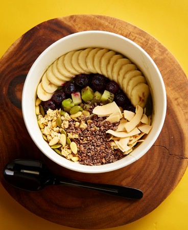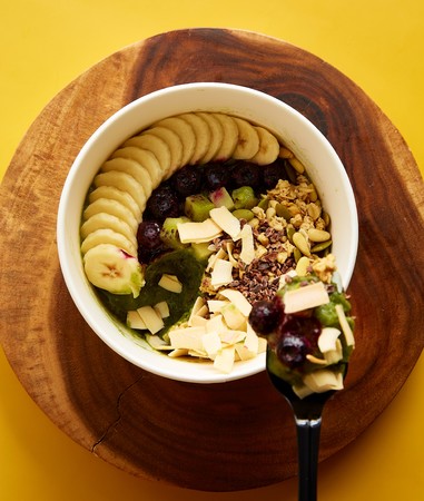タンパク質をしっかり摂れるヘンププロテインに「スーパーフードの王様」と呼ばれるほど栄養価の高い生スピルリナ「タベルモ」が入った栄養満点のフルーツボウル!程よい甘さとさっぱりしたフルーツの酸味がアクセント。