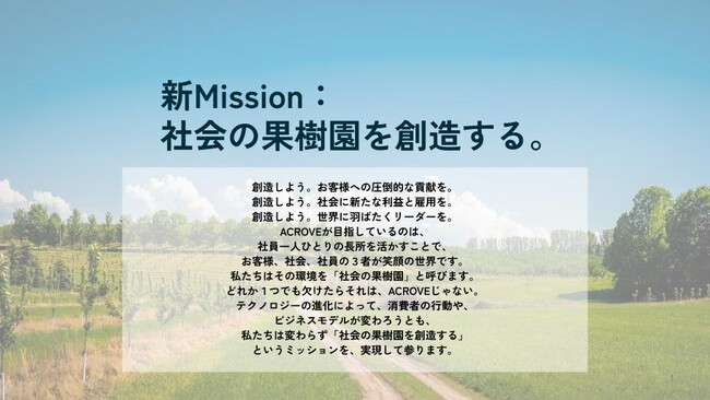 2023年に創業5年目を迎え、ACROVEではミッション・ビジョン・バリューを改訂するため改めて当初の目的を見直したところ、「社会の果樹園を創造する。」をミッションに据え置くことに決定いたしました。