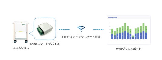 そこで今回、obnizの機器IoT化ソリューション「obniz Now」を導入し、遠隔監視システムを構築しました。エコムシュウにobnizのスマートデバイスを後付けし、スマートデバイス内蔵のLTEでインターネット接続。本システムにより、Webダッシュボードから、エコムシュウの利用状況やエラーを機器単位・全社単位で一元管理できるようになりました。