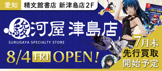 7月下旬は買取のみのプレオープン、そして8月4日(金)はセール&買取のグランドオープン!ホビーアイテムのお買物、ご不要になったおもちゃを売るなら「駿河屋津島店」へ!