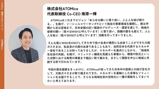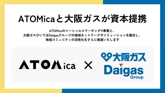 株式会社ATOMica(本社:宮崎県宮崎市、代表取締役:嶋田 瑞生、南原 一輝、以下「ATOMica」)は、大阪ガス株式会社(本社:大阪府大阪市、代表取締役社長:藤原 正隆、以下「大阪ガス」)と資本提携に関する契約を締結しました。