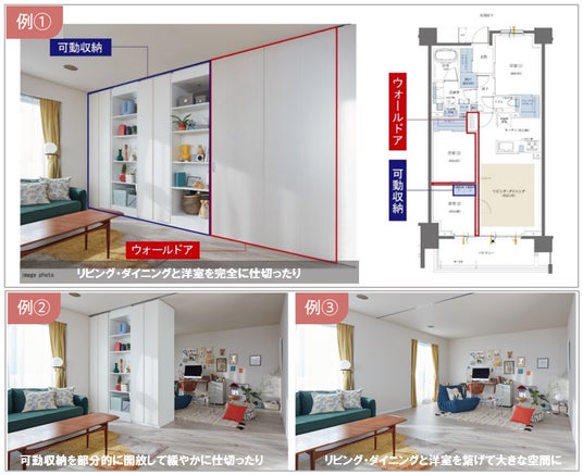 本物件では、ライフスタイルやライフステージの変化に柔軟に対応できる「間取りのない家」プランを採用しました。「間取りのない家」は、キャスター式で移動できる可動収納と、T字型ウォールドアを併用することで、広々とした1LDKから3LDKまで、間取りを自由に変えることができるプランです。例えば、普段はワークスペースとして使用しているリビング・ダイニングに面した洋室を、来客時は仕切りを開放して大空間にしたり、お子様の成長に合わせて子供部屋を確保したり、生活シーンやライフステージの変化に合わせてフレキシブルに空間を変更できます。家族構成に変化が生じた際も、リフォームすることなく、間取りを家族構成に合わせることができる住まいを実現しました。可動収納はハンドル操作で1人でも動かすことができ、固定しやすいよう操作性を高めました。