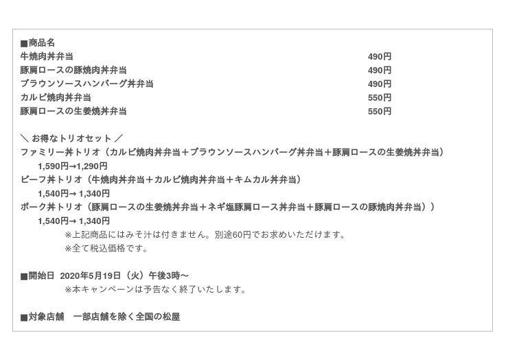 株式会社松屋フーズ(本社:東京都武蔵野市、代表取締役社長:瓦葺 一利)では、牛めし・カレー・定食・その他丼の「松屋」におきまして、昨今お弁当需要が高まる中、バラエティー豊富な松屋のメニューをご家庭で楽しんでいただきたいと思い、テイクアウト限定で松屋の人気定番定食をよりお買い求めやすい「丼」にてご提供いたします。各種490円よりお買い求めいただけ、お得なトリオセットもご用意いたしました。中でも、twitter松屋公式アカウントでのアンケートで人気投票No.1に輝いたトリオセットはなんと300円引きに!