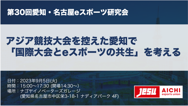 一般社団法人 愛知eスポーツ連合(JeSU愛知、所在地:愛知県名古屋市、代表:片桐正大)は2023年9月5日(火)、第30回愛知・名古屋eスポーツ研究会をナゴヤイノベーターズガレージ(愛知県名古屋市中区栄3-18-1 ナディアパーク 4F)にて開催いたします。