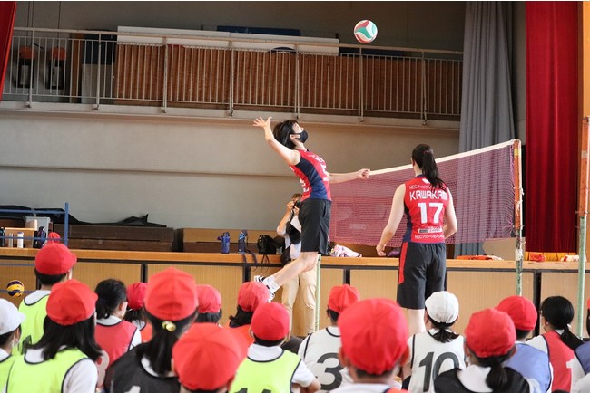 スパイク練習では吉田選手のキレキレのスパイクのお手本を見て、「すごい!かっこいい!」と大盛り上がり。「ガッツポーズの位置でヒットしましょう」と吉田選手からのアドバイスを受け、子どもたちも積極的にチャレンジしている姿が見られました。