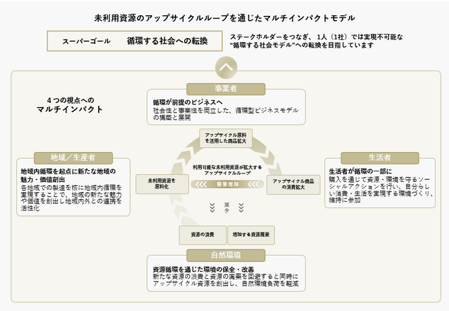 ファーメンステーションの事業の根幹にあるものは「未利用資源のアップサイクルループ」です。未利用資源をアップサイクルした原料や商品が広がることを通じて、「地球環境」「地域/生産者」「事業者」「生活者」のマルチステークホルダーにポジティブなインパクトを与えることができるモデルであると定義をしました。これらのマルチインパクトが集約された結果として、最終的なスーパーゴールとして「循環する社会への転換」を目指したいと考えています。