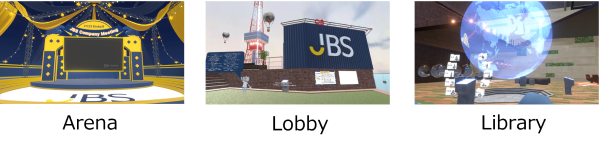 「JBSメタバース」には全社会議を実施する「Arena」のほかに、交流のメインとなる空間である「Lobby」、動画コンテンツを視聴できる「Library」と、3つのルームを準備しました。ユーザーは自分の顔写真を設定したアバターを操作し、各ルームでさまざまなコンテンツやアバター同士の交流を楽しむことができるようにしました。