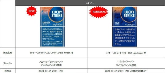 BATジャパン(本社:東京都港区、社長:エマ・ディーン、正式社名:ブリティッシュ・アメリカン・タバコ・ジャパン合同会社)は1月29日(月)より、加熱式たばこ「glo(TM)(グロー)」専用たばこスティックとして、厳選たばこ葉を使用し、妥協なき味わいを追求した新レギュラーブレンド銘柄「ラッキー・ストライク・スムース・タバコ・glo hyper用」を新発売します。また、定番レギュラー銘柄「ラッキー・ストライク・リッチ・タバコ・glo hyper用」も新ブレンドを採用して順次リニューアル(※1)します。どちらもお求めやすい400円(税込)にて、全国の主要コンビニエンスストア(※2)、主要スーパーマーケット(※2)、たばこ販売店(※2)、glo(TM) & VELO オフィシャルオンラインショップで順次展開いたします。