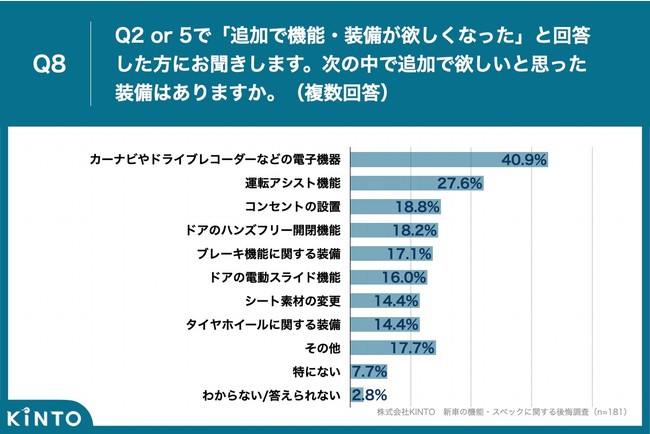 また、次の中で追加で欲しいと思った装備はあるかと質問したところ、「カーナビやドライブレコーダーなどの電子機器」が40.9%、「運転アシスト機能」が27.6%、「コンセントの設置」が18.8%という回答となりました。