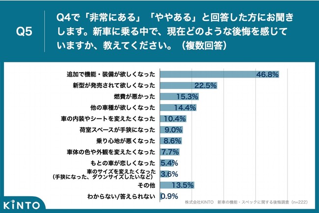 新車購入後と同じく「追加で機能・装備が欲しくなった」(46.8%)が1位となった他、「新型が発売されて欲しくなった」(22.5%)、「燃費が悪かった」(15.3%)という回答が続きました。