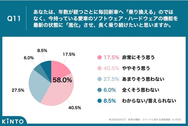 新車への買い替えに高いハードルを感じる人が多いことがわかりました。そこで、年数が経つごとに毎回新車へ「乗り換える」のではなく、今持っている愛車のソフトウェア・ハードウェアの機能を最新の状態に「進化」させ、長く乗り続けたいかと質問したところ、「非常にそう思う」が17.5%、「ややそう思う」が40.5%という回答となりました。