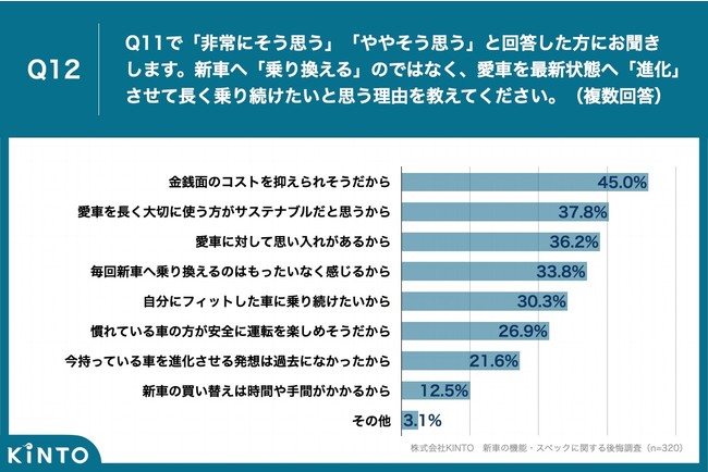 その理由に4割以上が「金銭面のコストを抑えられそうだから(45.0%)」と答え、新車購入に比べて金銭面の負担が少ないことが挙げられました。その他にも、「愛車を長く大切に使う方がサステナブルだと思うから(37.8%)」や「愛車に対して思い入れがあるから(36.2%)」といった、愛車を大切に思う気持ちや、愛車を大切にすることで社会にも貢献したいという意見も見られました。