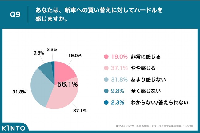 あらゆる角度から新車購入後の後悔の声が寄せられましたが、新車への買い替えに対してハードルを感じるかと質問したところ、「非常に感じる」が19.0%、「やや感じる」が37.1%という回答となりました。